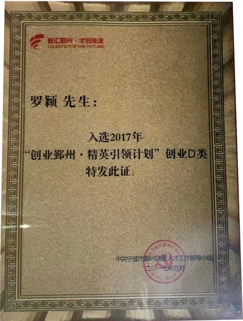 入選2017年“創(chuàng )業(yè)鄞州·精英引領(lǐng)計劃”創(chuàng )業(yè)D類(lèi)