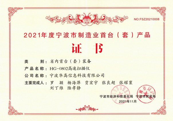 HG-0802型號產(chǎn)品獲得2021年度寧波市首臺(套)產(chǎn)品證書(shū)